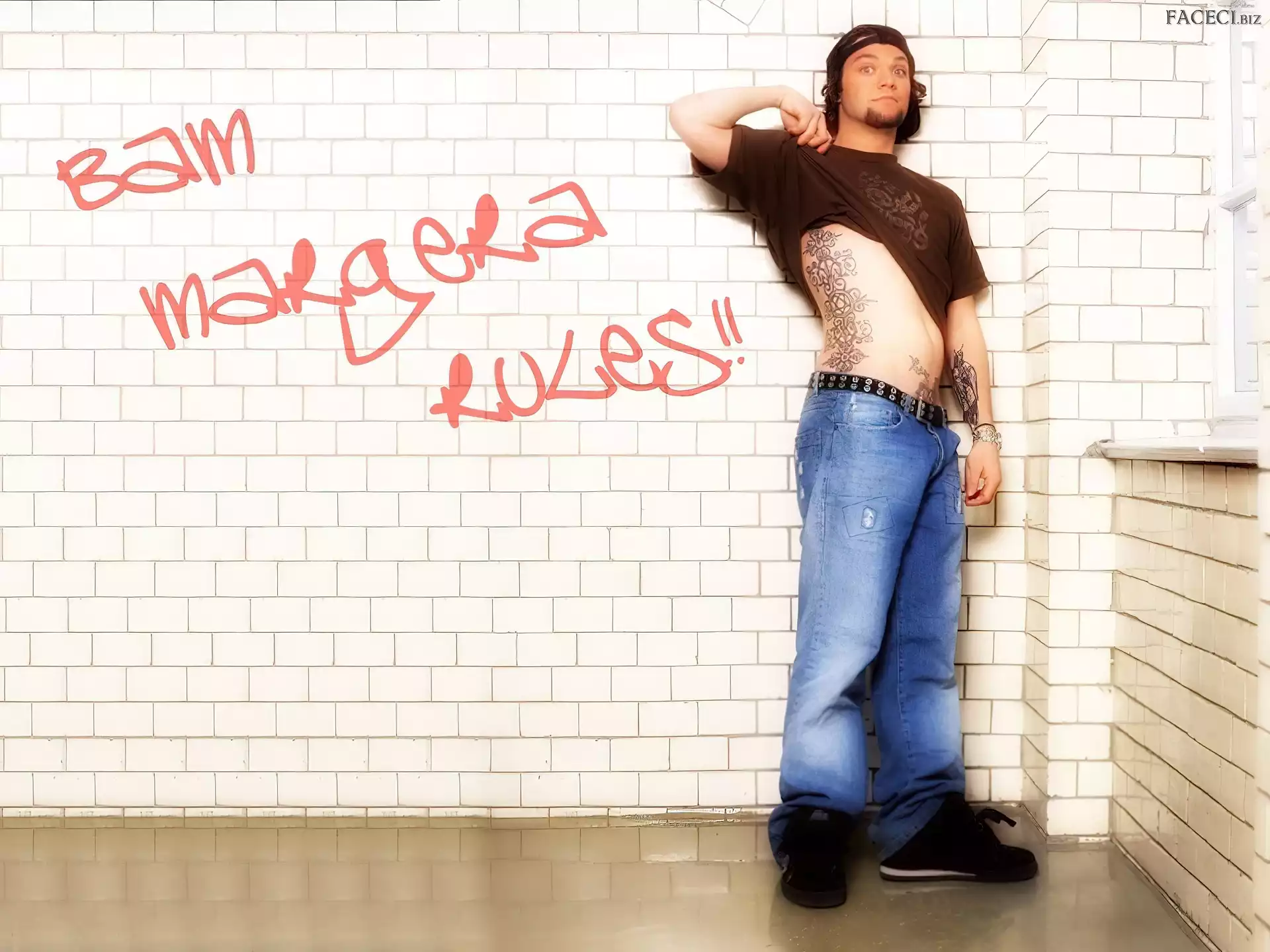 kurtka, Bam Margera, rozpięta zegarek, Bam Margera, deskorolka t-shirt, Bam Margera, brązowy okulary, Bam Margera, butelka włosy, Bam Margera, ciemne okulary, Bam Margera, twarze